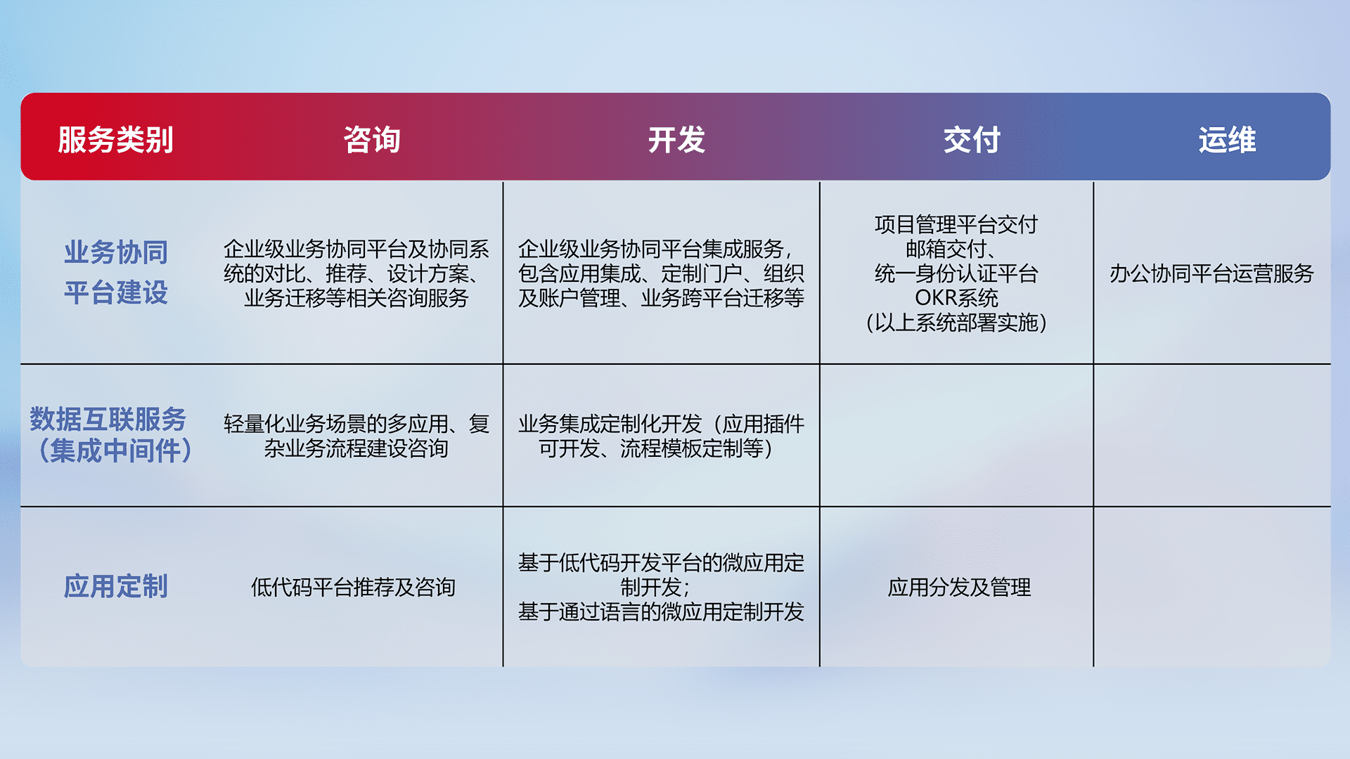 针对钉钉、、企微、、IDaas等平台级产品提供产品的规划、、、、方案、、交付、、定制化开发等服务,,实现如统一协同办公、、、智能客户服务、、混合会议管理、、智能数据查询、、等业务场景,,,实现数字化转型。。。