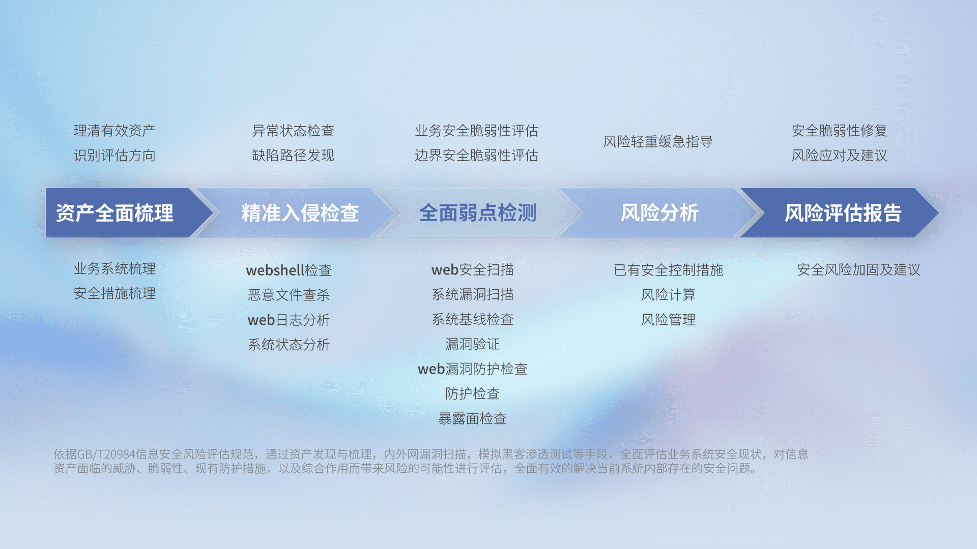 针对客户行业特性,,,,以专业的安全服务+多厂商联合解决方案提供专属的一站式安全管理服务,,帮助客户全面感知网络空间威胁,,,,基于识别、、、、检测、、、、分析、、、、防护、、、监测、、响应的服务理论模型,,,,从方案咨询、、、集成交付、、、、评估验证、、优化加固、、、、运维运营,,,,致力于为客户提供完整的闭环管理式安全服务。。。。以实战经验为客户打造高抵御风险的安全体系,,,,帮助客户发现威胁、、、对抗威胁、、、、处置威胁,,,不断积累安全对抗能力,,,,持续保障数字化安全。。。
